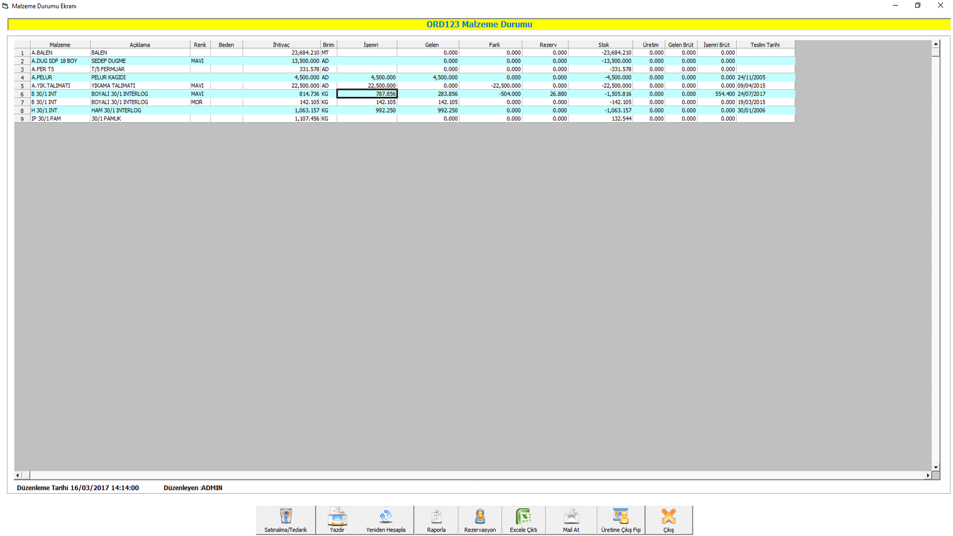 - Malzeme planlama detaylarını Excel ortamına aktarabilirsiniz.