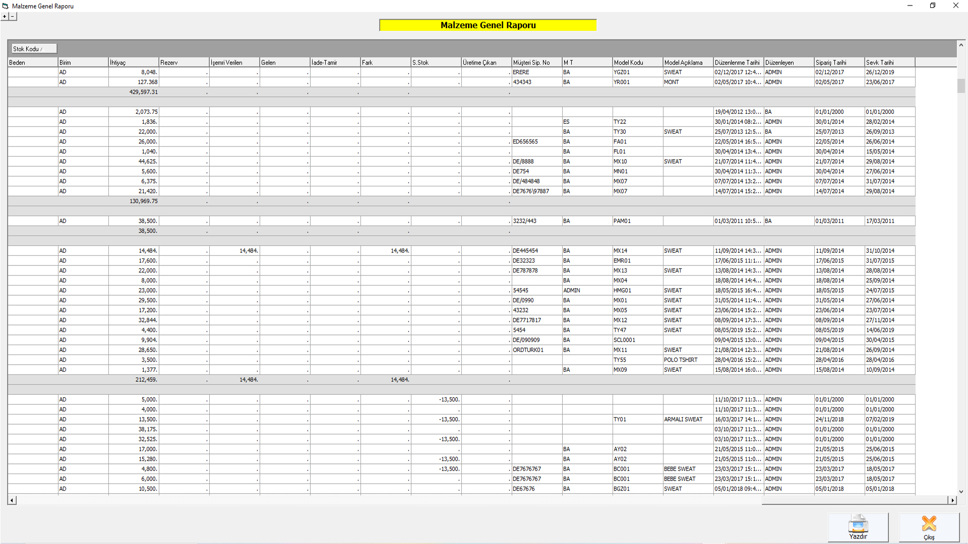 - “Malzeme Genel Raporu” ile malzeme kodu, model kodu ya da sipariş numarasına göre gruplayarak raporlar alabilirsiniz.