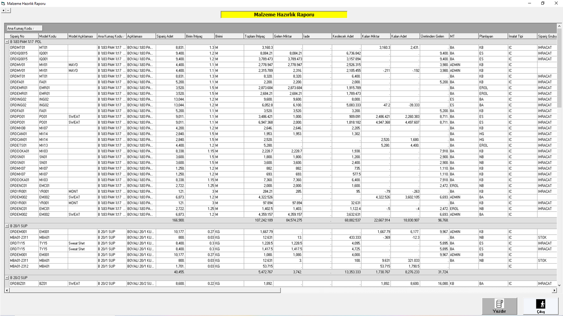 - Ana stok tiplerine göre malzeme listesi alabilirsiniz. Aksesuar ve kumaş ihtiyaçlarını ayrı ayrı listeleye bilirsiniz.
