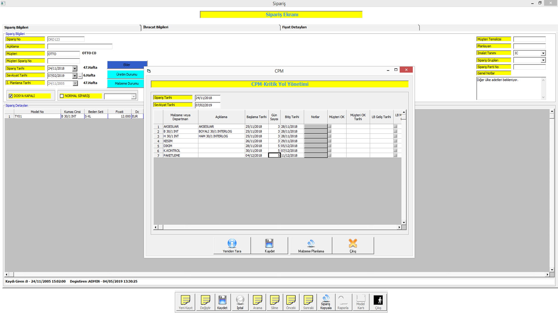 - Siparişin her modeli için CPM(Kritik yol yönetimi) bilgilerini girebilirsiniz.